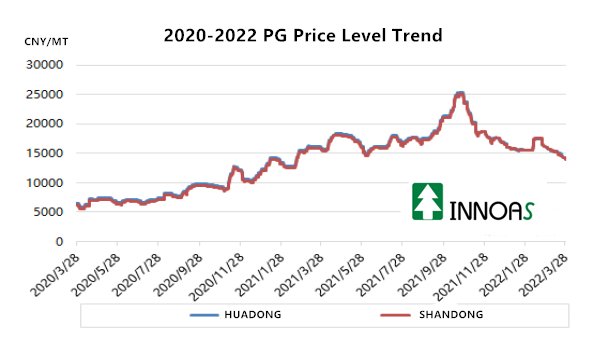 In the past 22 years, the domestic propylene glycol market rose first and then fell, ending with a decline as a whole. The first quarter is coming to an end, and propylene glycol may end in a downward trend, especially in March when the epidemic returned, and due to the conflict between Russia and Ukraine, the export orders of factories decreased, and the price of propylene glycol continued to decline. Taking Shandong as an example, the high point in this quarter was around 17,500 yuan/ton in mid-February, and the low point was around 14,000 yuan/ton at the end of March. The price difference between high and low prices was 3,500 yuan/ton. Downtrend, down 12.5%. What is the trend in the second quarter, detailed analysis is as follows.